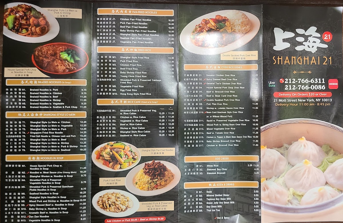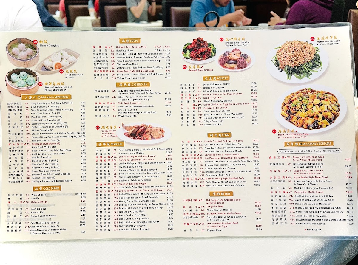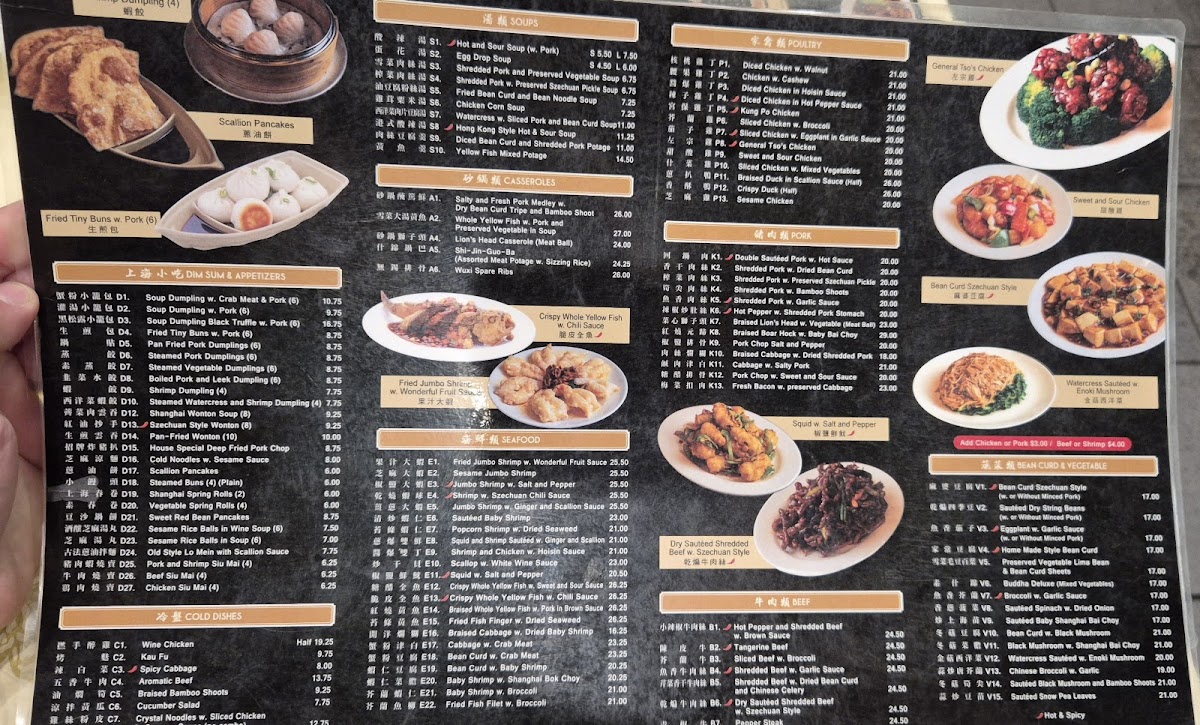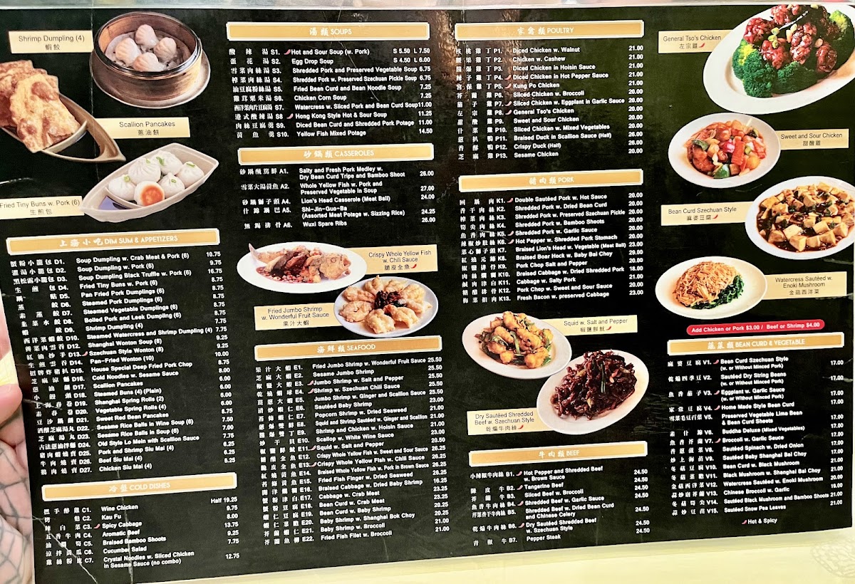 Additionally, the menu features traditional Shanghainese specialties such as dim sum items, soup dumplings including crab and pork varieties, scallion pancakes, hot and sour soup, Szechuan style wontons, Shanghai spring rolls, dan dan noodles, fried dumplings, sweet and sour chicken, sautéed dry string beans, egg drop soup, and the house special pork chop with noodles in soup.