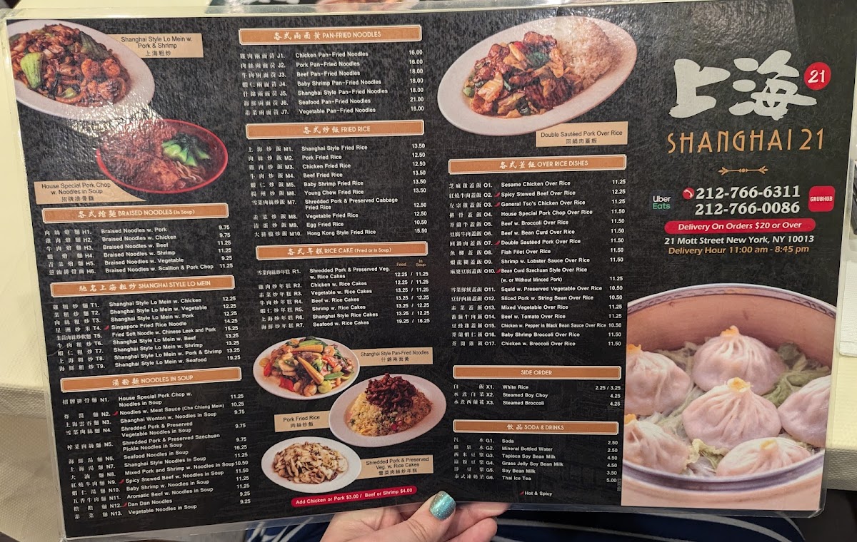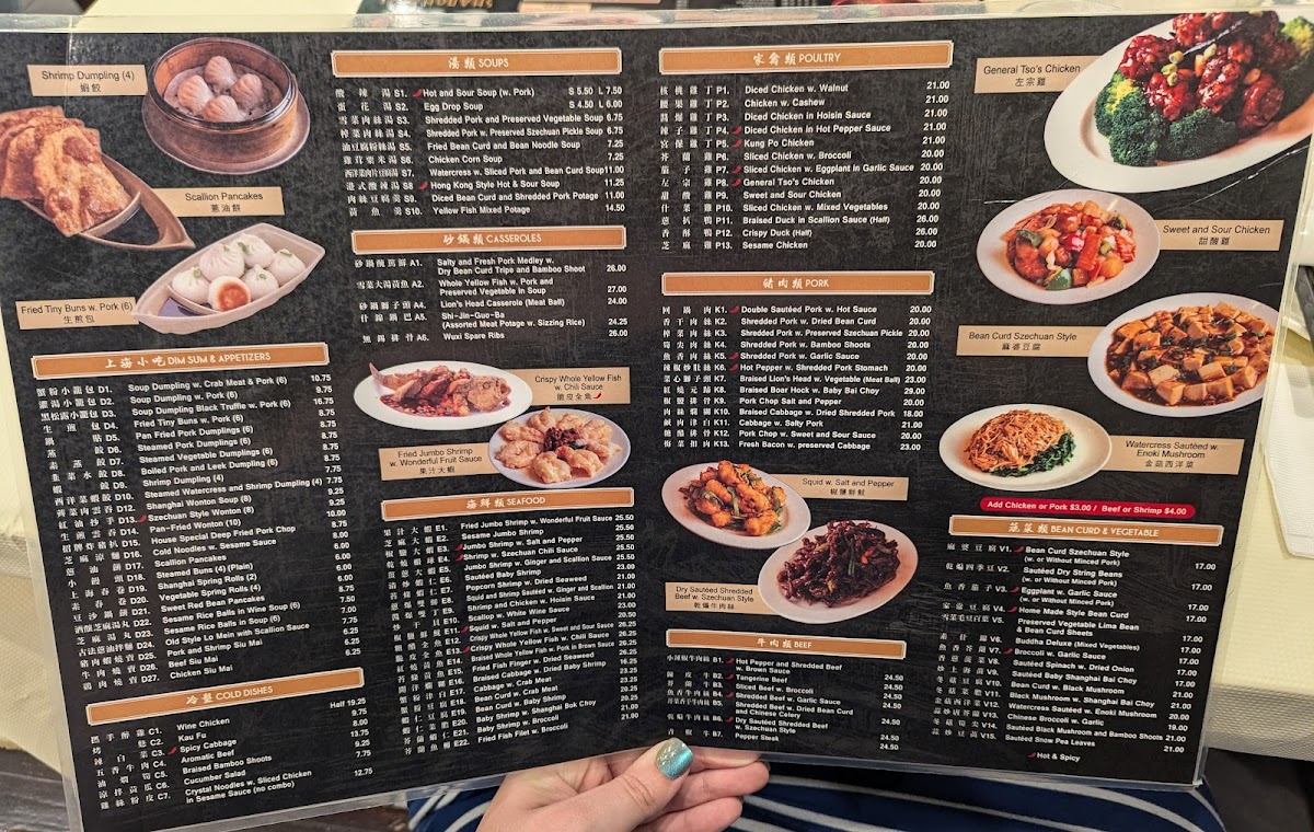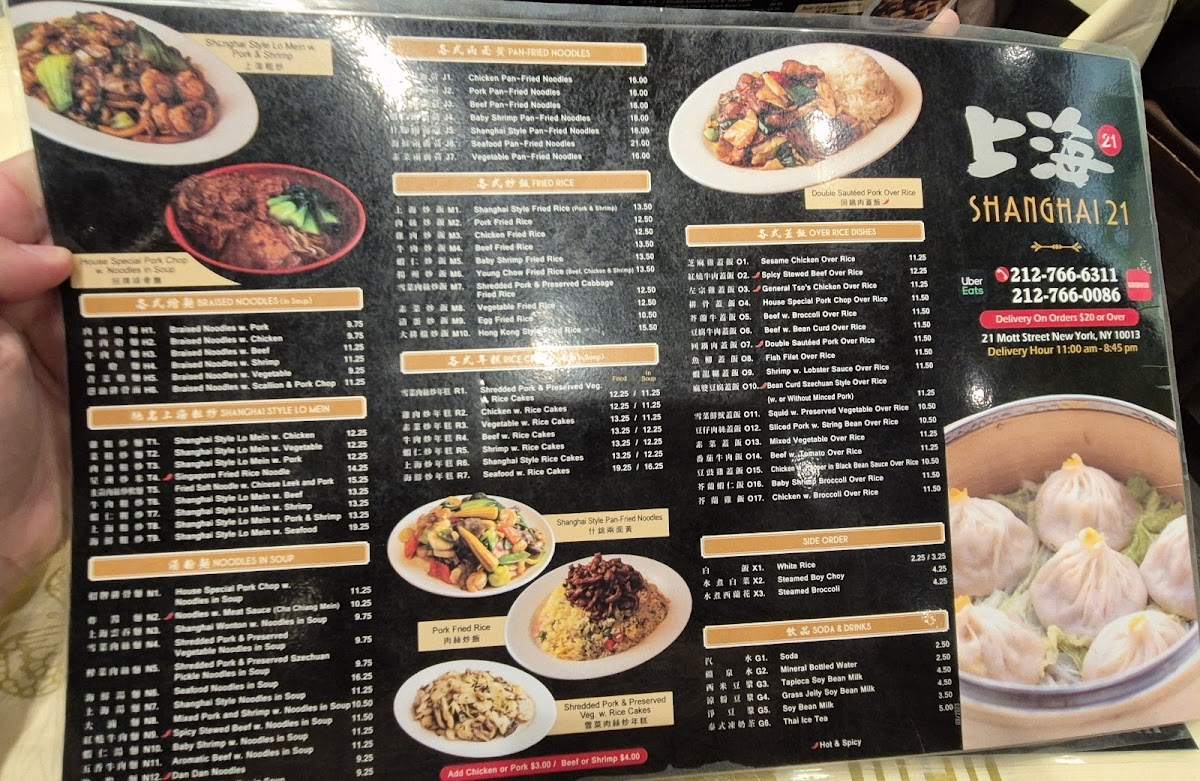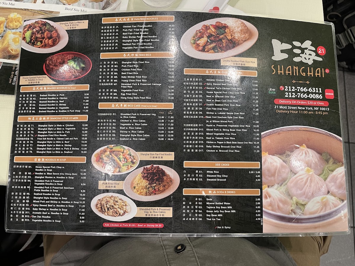 Additionally, the menu features traditional Shanghainese specialties such as dim sum items, soup dumplings including crab and pork varieties, scallion pancakes, hot and sour soup, Szechuan style wontons, Shanghai spring rolls, dan dan noodles, fried dumplings, sweet and sour chicken, sautéed dry string beans, egg drop soup, and the house special pork chop with noodles in soup.